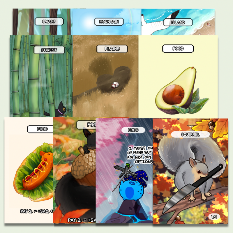 Magic: The Gathering is a trademark of Wizards of the Coast. To respect their copyright, I don’t use mana symbols, set icons, or official rules text—each design tells the story through the art itself.